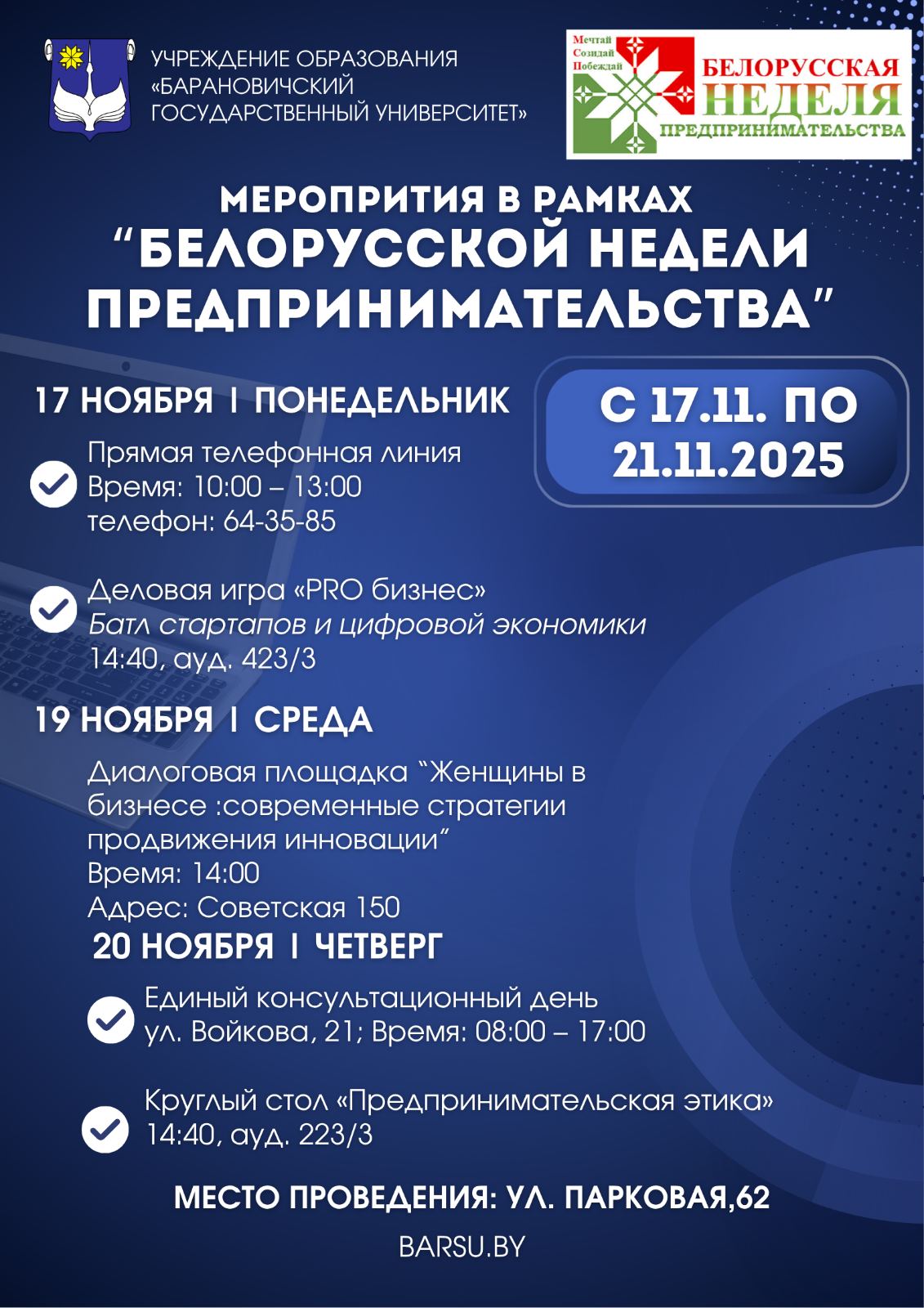 Учреждение образования «Барановичский государственный университет» приглашает Вас принять участие в деловой игре «PRO бизнес: баттл стартапов и цифровой экономики», которая проводится в рамках Белорусской недели предпринимательства.